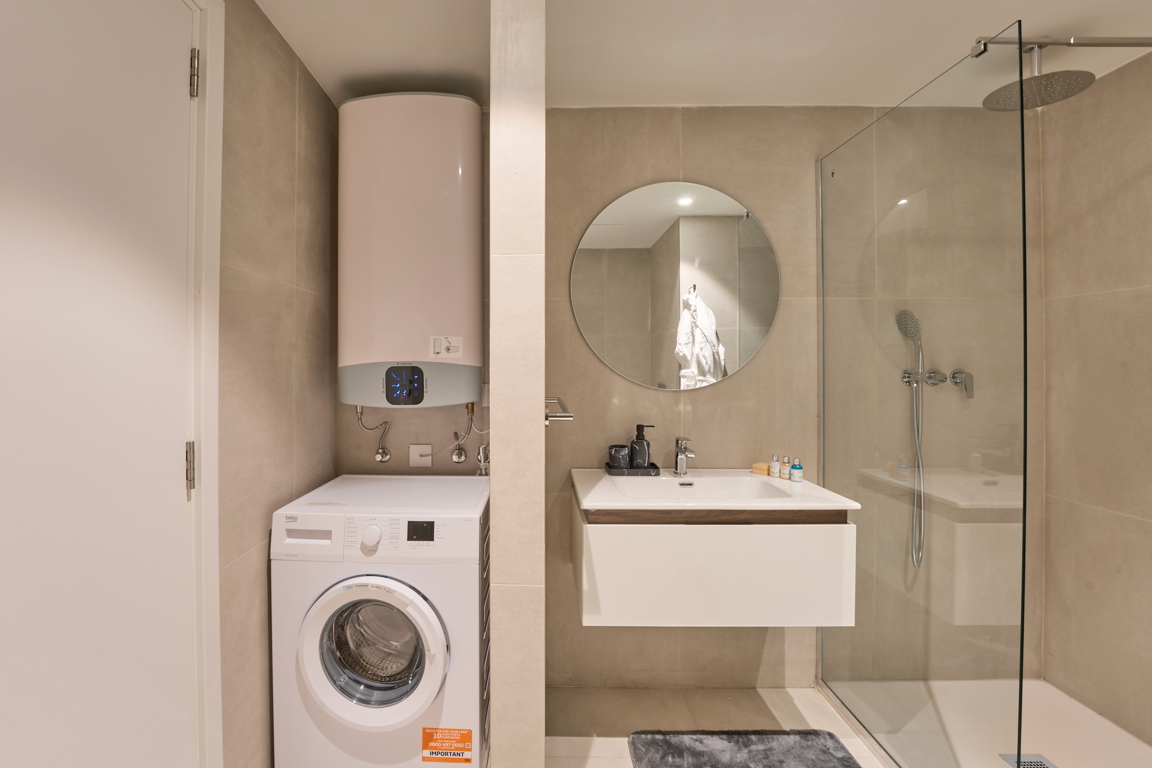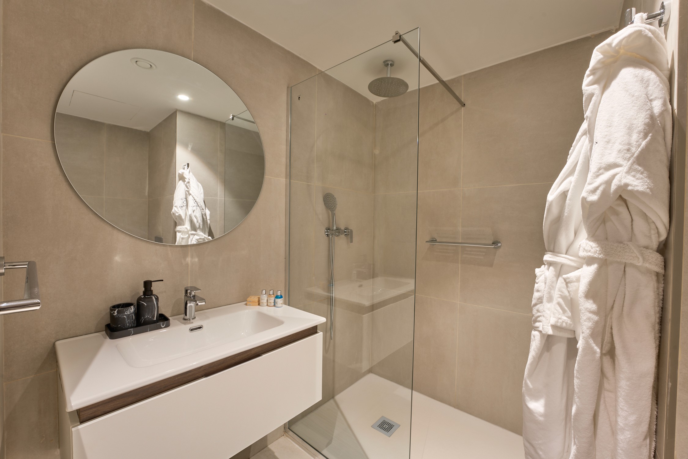 • Modern bathroom with walk-in rain shower