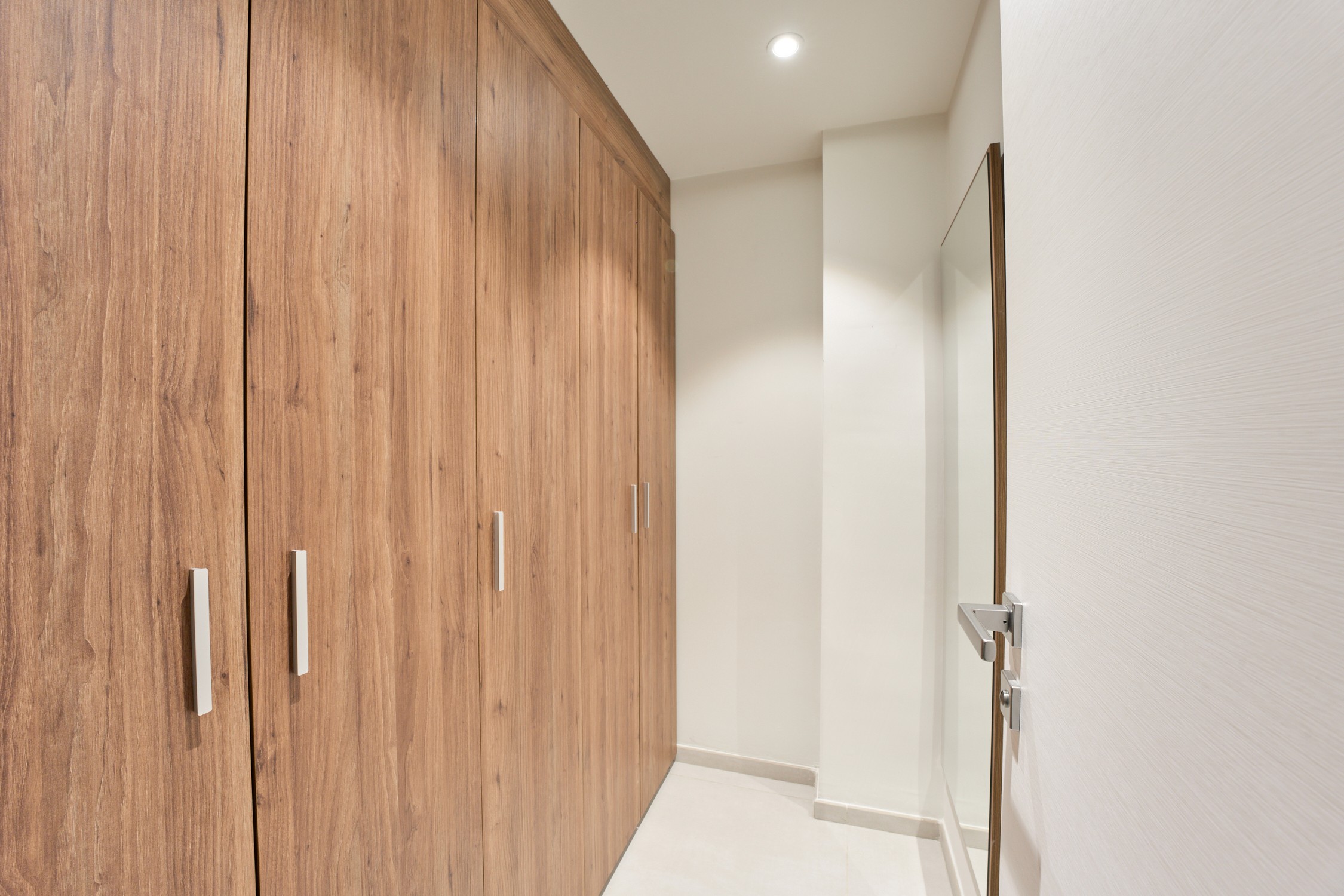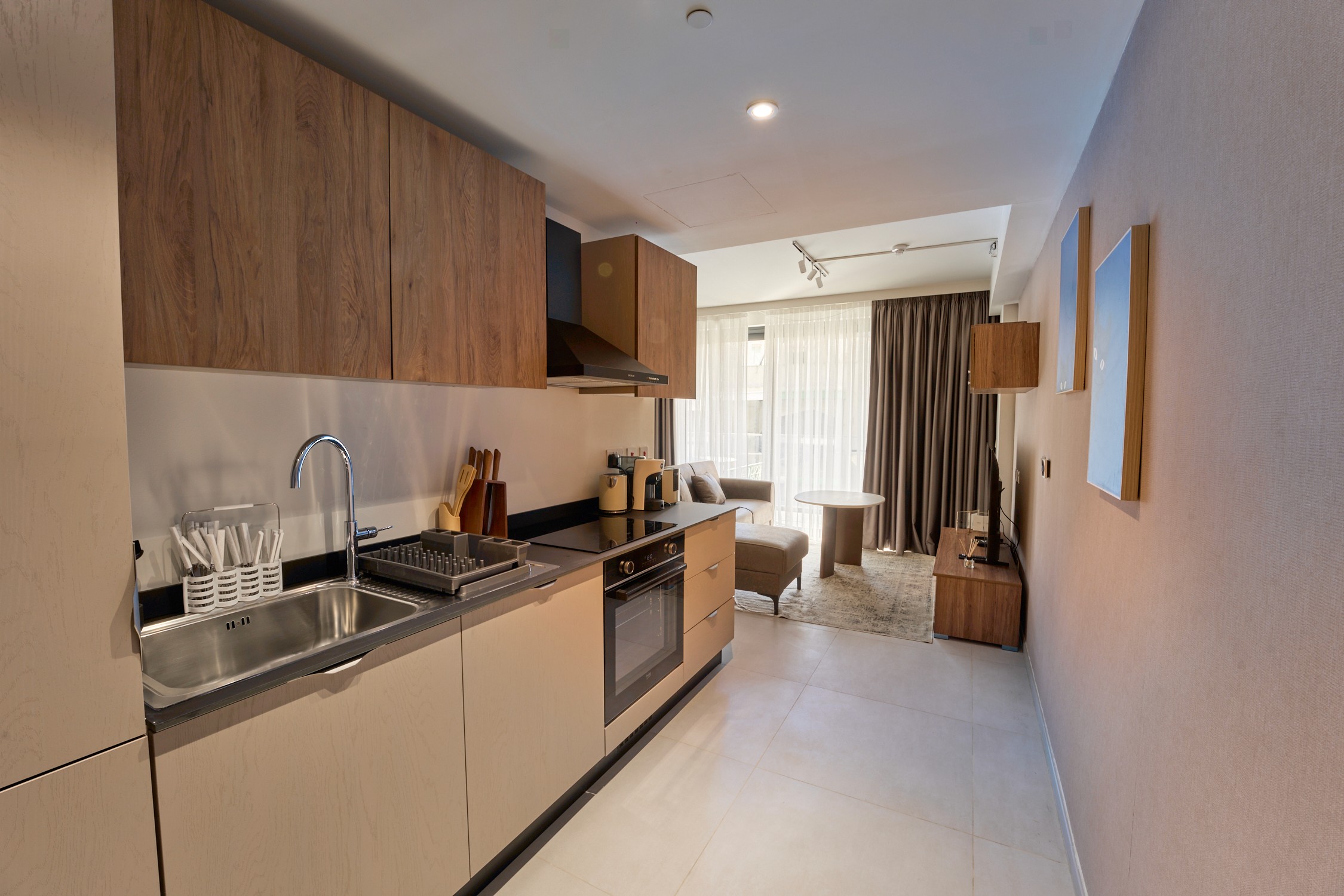 The apartment features a clean, modern layout with warm finishes and plenty of natural light.